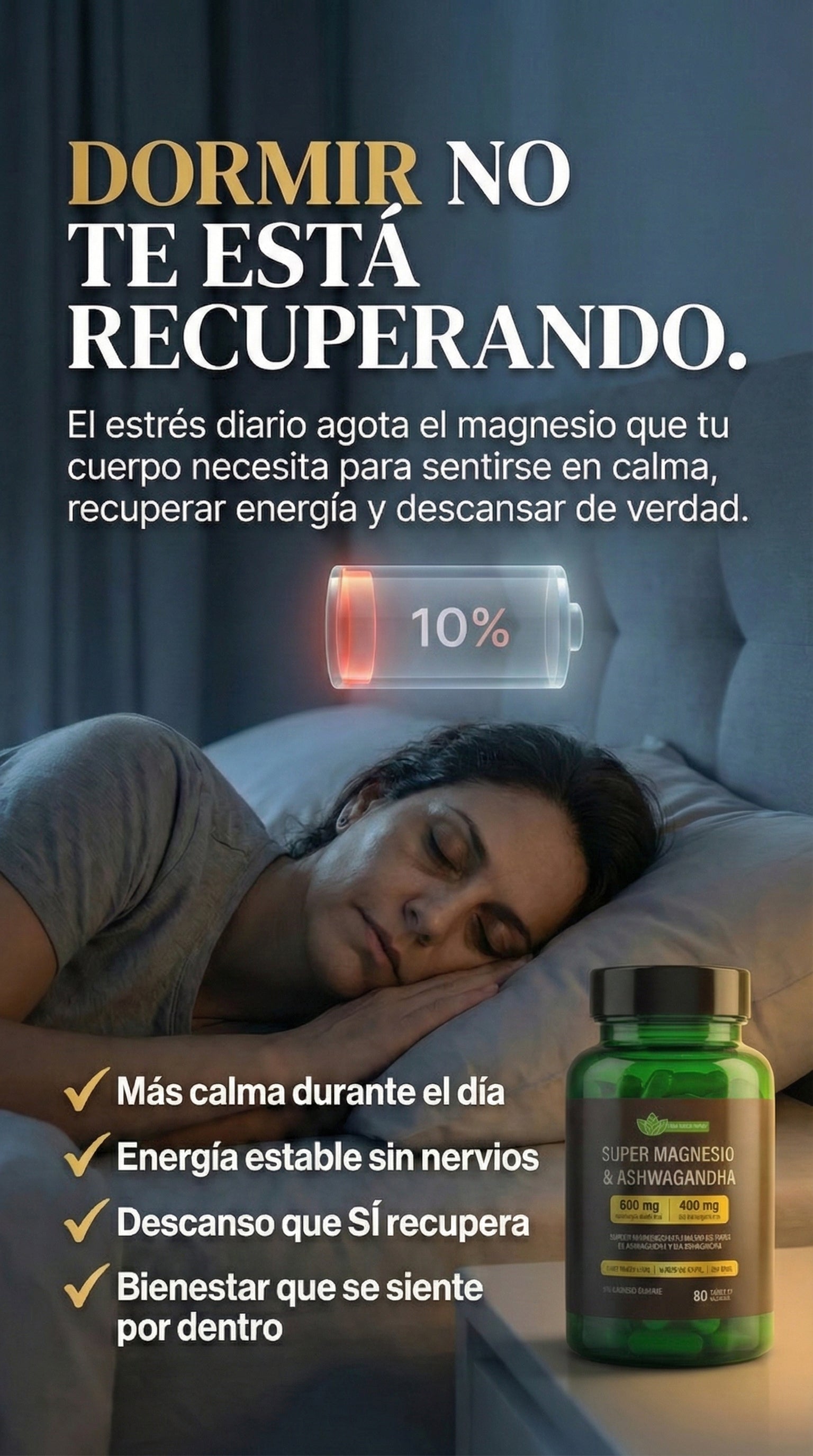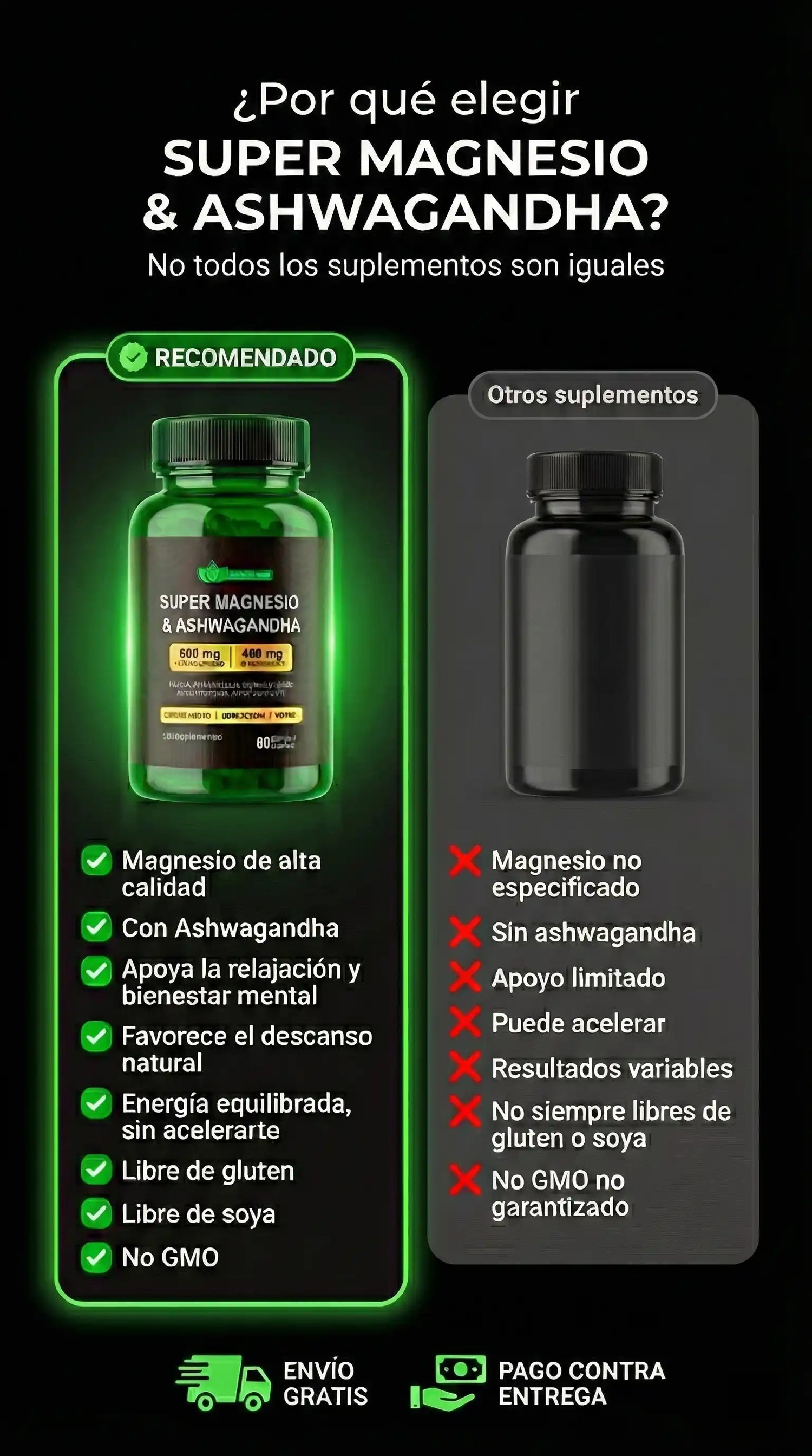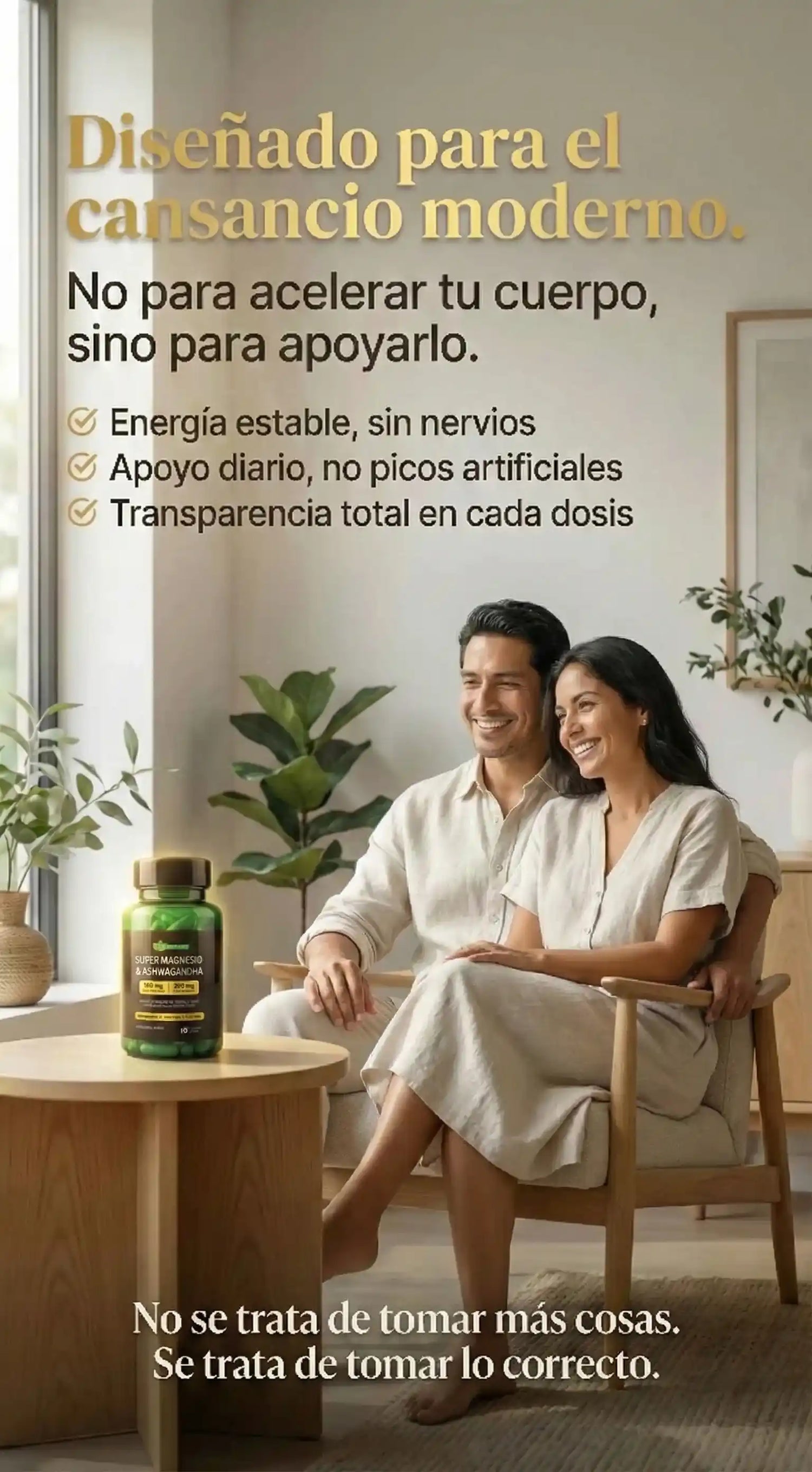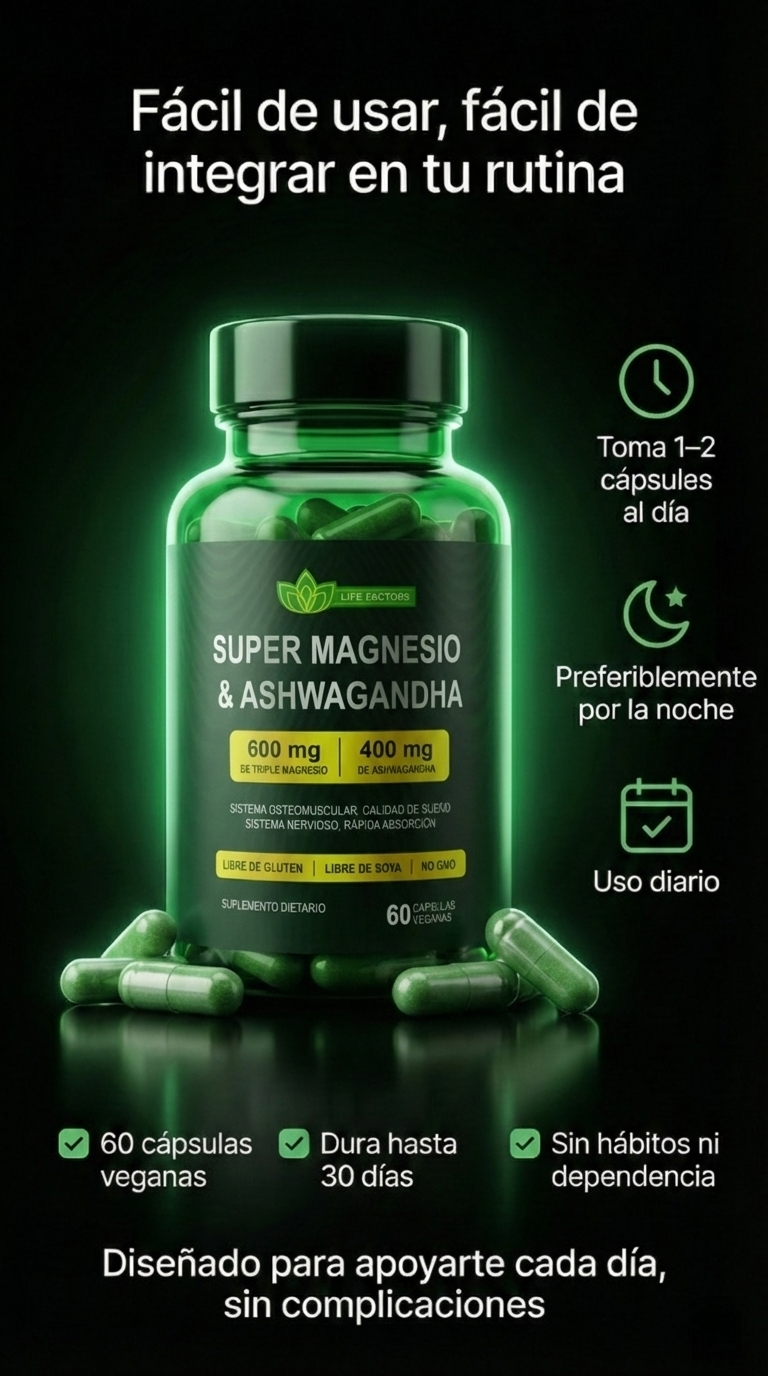 La fórmula integra magnesio junto con ashwagandha, un adaptógeno natural, para apoyar tanto el cuerpo como la respuesta al estrés diario, en lugar de enfocarse únicamente en un solo aspecto.