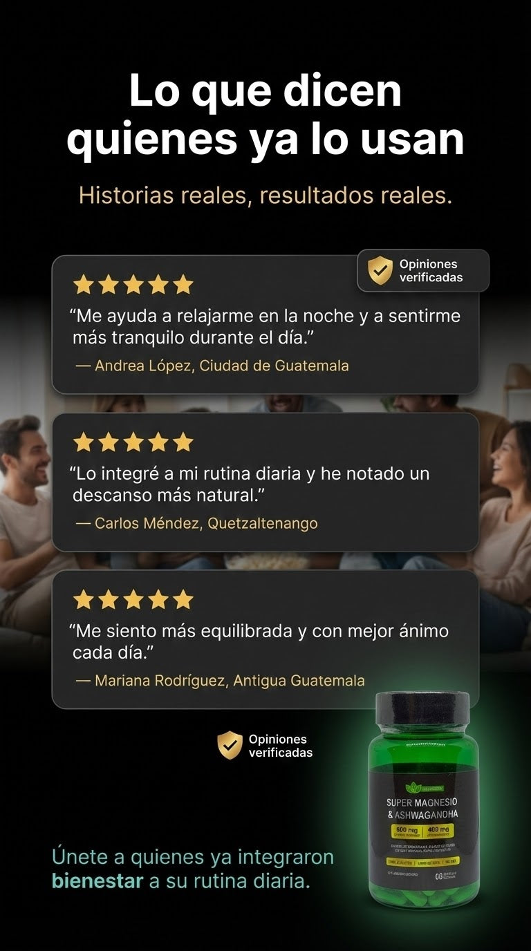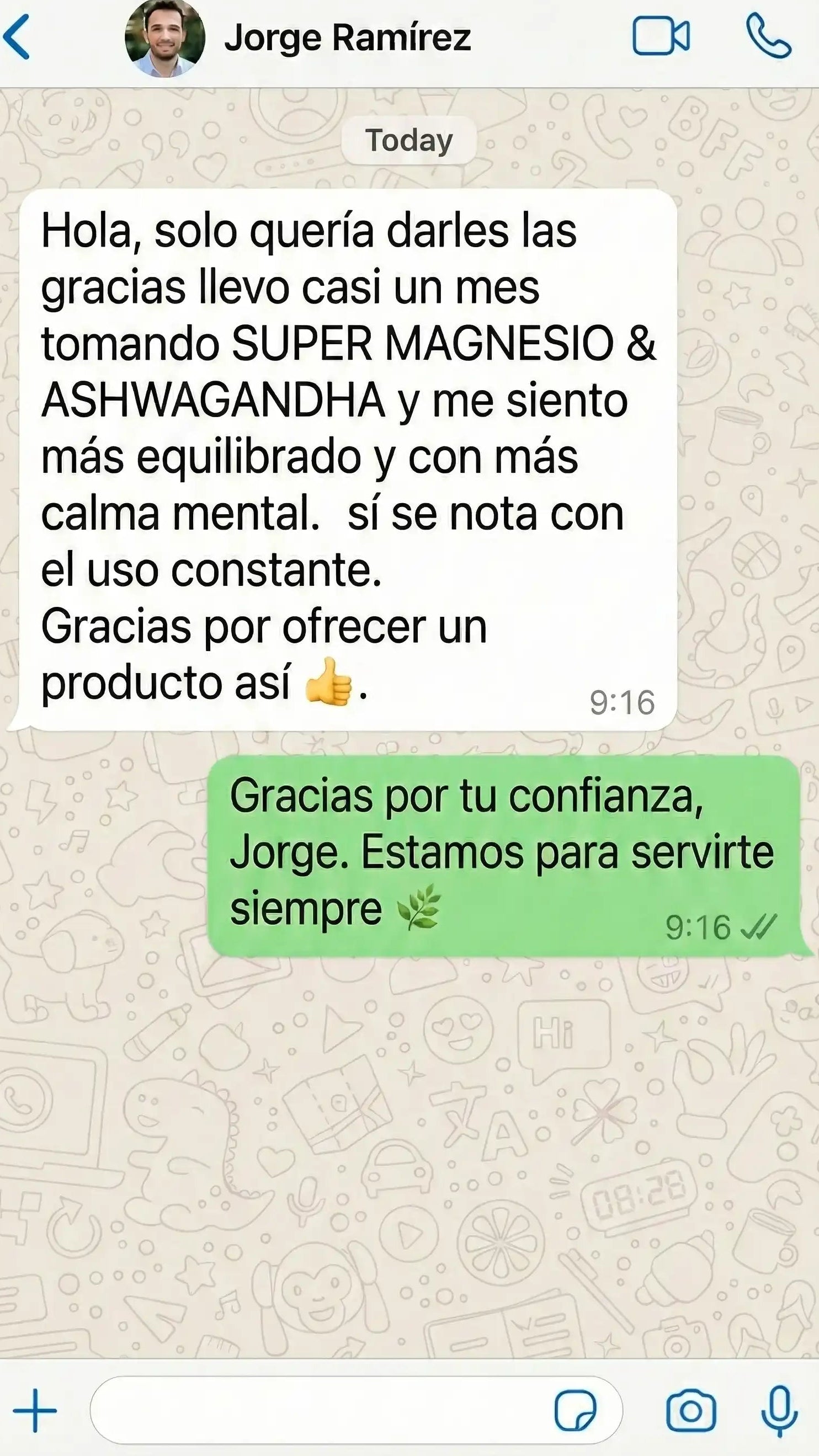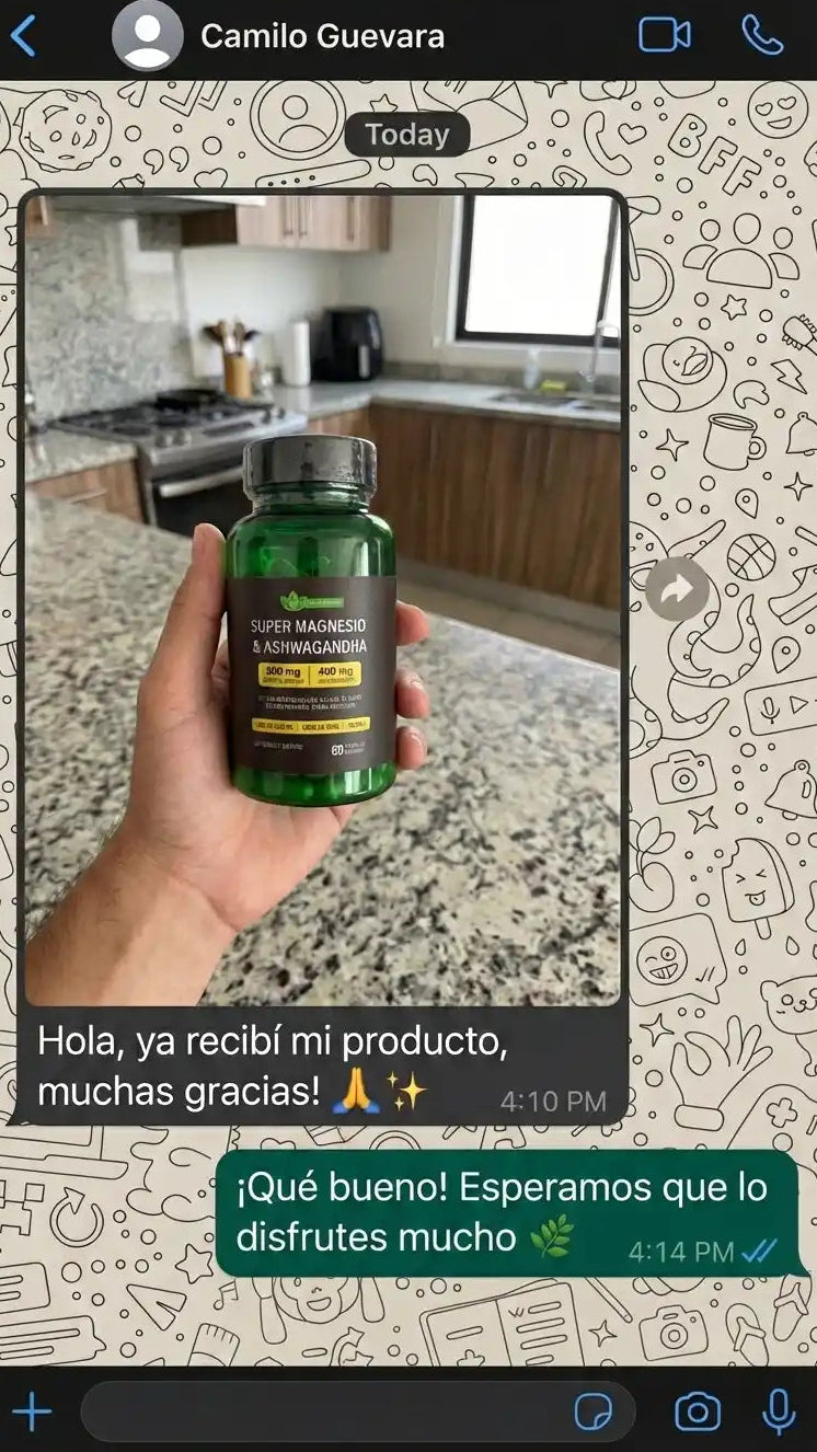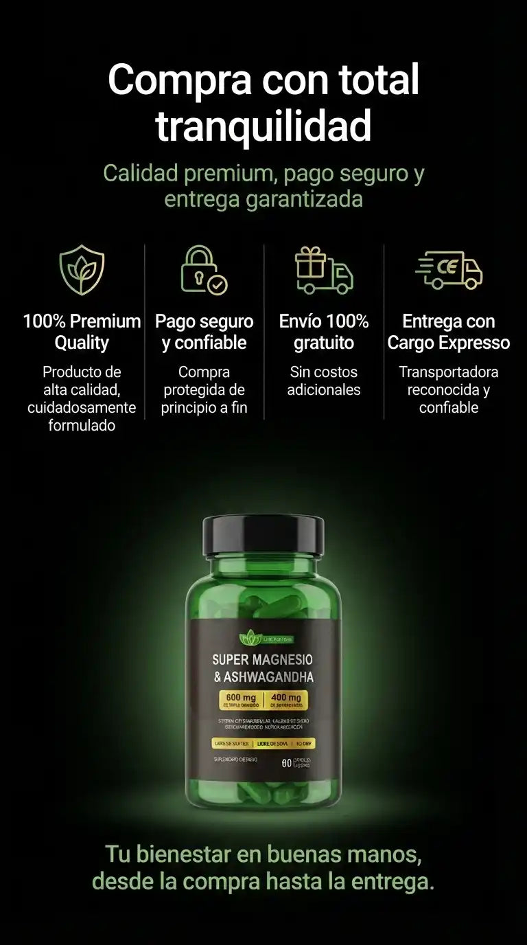 La fórmula integra magnesio junto con ashwagandha, un adaptógeno natural, para apoyar tanto el cuerpo como la respuesta al estrés diario, en lugar de enfocarse únicamente en un solo aspecto.